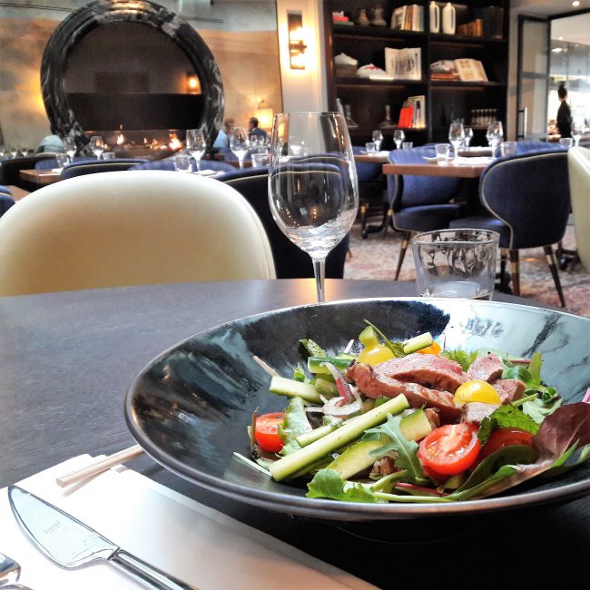 My dining companion chose the salad with grilled strips of beef. It was good, but he could not help noting that it was, at €24, the most expensive lunch he had ever had. We agreed, however, that the atmosphere was so special that money didn’t matter at that moment and we would love to visit IZAKAYA in the evening. Is definitely sexy to dine by the fireplace and then end the evening at the bar…
