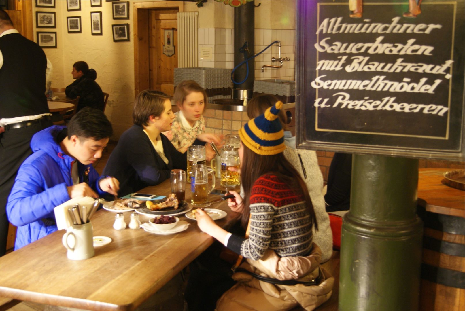 In the halls of the old Augustinian brewery, the guest has the choice between the cozy dining room, which is, however, often crowded, and the large beer hall in which one will always find a spot somewhere on the long tables. If you call for reservation in advance, this is the ideal place for larger groups as well. The noise level is always similar to the Oktoberfest, but that’s part of the experience, while you taste the Augustinian beer and a hearty roast pork with potato dumplings and crust. The waiters and waitresses are appropriately dressed traditionally Bavarian.