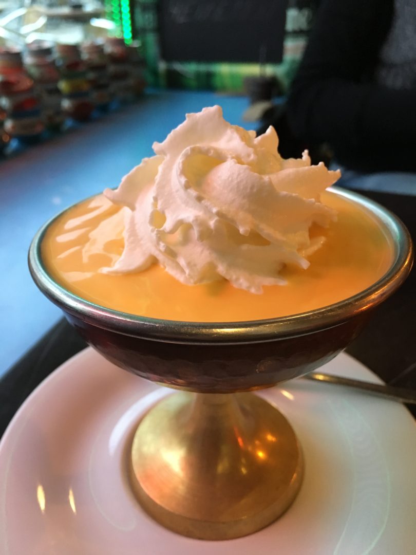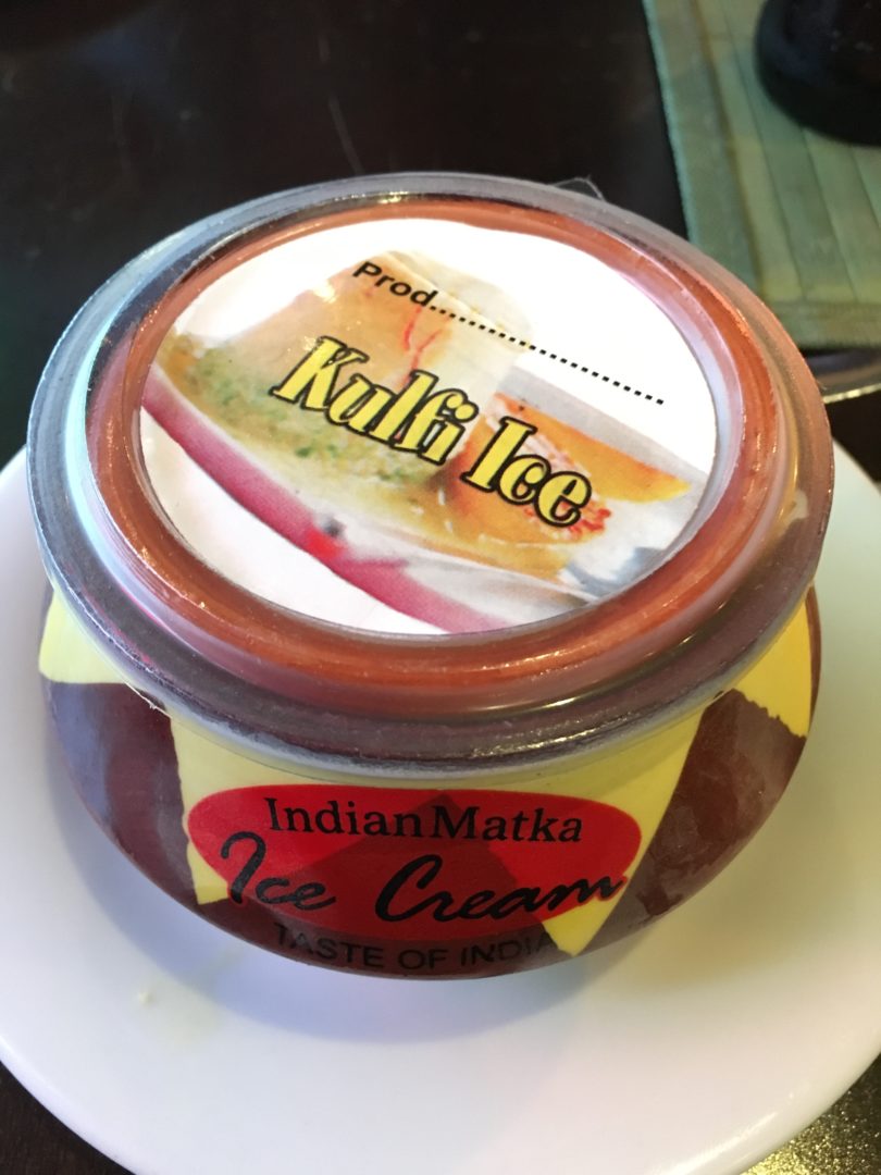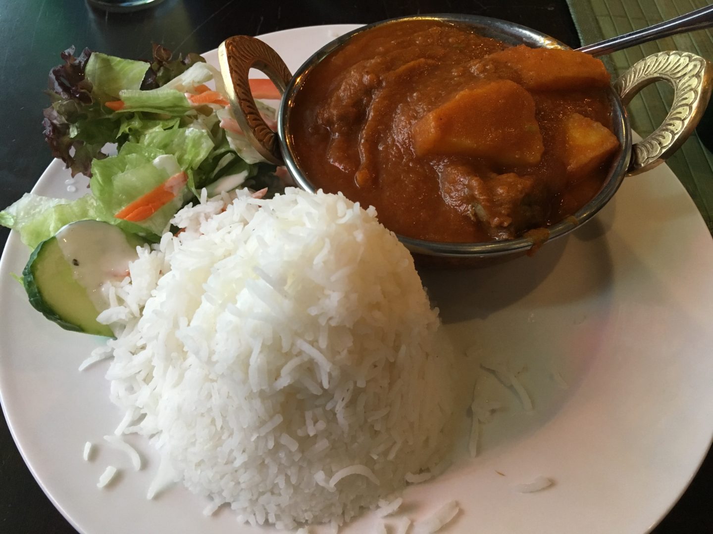 The interior reminds in part of an Indian palace and in part of Bollywood. The music adds to this atmosphere. The service is attentive, fast and extremely friendly. The kitchen appears to already know which dishes will be ordered – we don’t have to wait long for our food. My wife opted for tamatar ka shorba (a tomato soup) with a side of naan bread with butter. I like lamb, so went for aloo gosht (lamb curry with potatoes, injure, coriander and Indian spices). The lamb curry was served with rice – a somewhat unusual combination when paired with diced potato. Despite the rating of two out of three on the spiciness scale, I did not find the curry particularly hot. It is debatable whether a side salad is also served with meals in India – quite beside the fact that this is long outdated. We washed down our meals with two different types of Indian lager, Cobra Beer and Kingfisher. The sweet conclusion came in the form of tasty mango creme and kulfi (Indian ice cream with milk, saffron flowers, pistachios and cardamom) served in little clay dishes that then stood empty in the window.