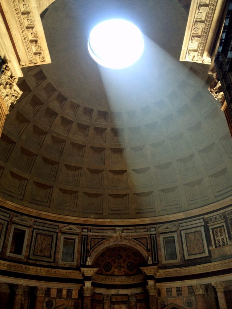 Visiting the Pantheon is really nice and you can show your children a real engineering masterpiece. This is a really big round temple with a hemispheric cupola. And this is the magic of this place: the only light inside the temple come from an opening at the ceiling, which is called „oculus“. This opening measure 9 meters of diameter.