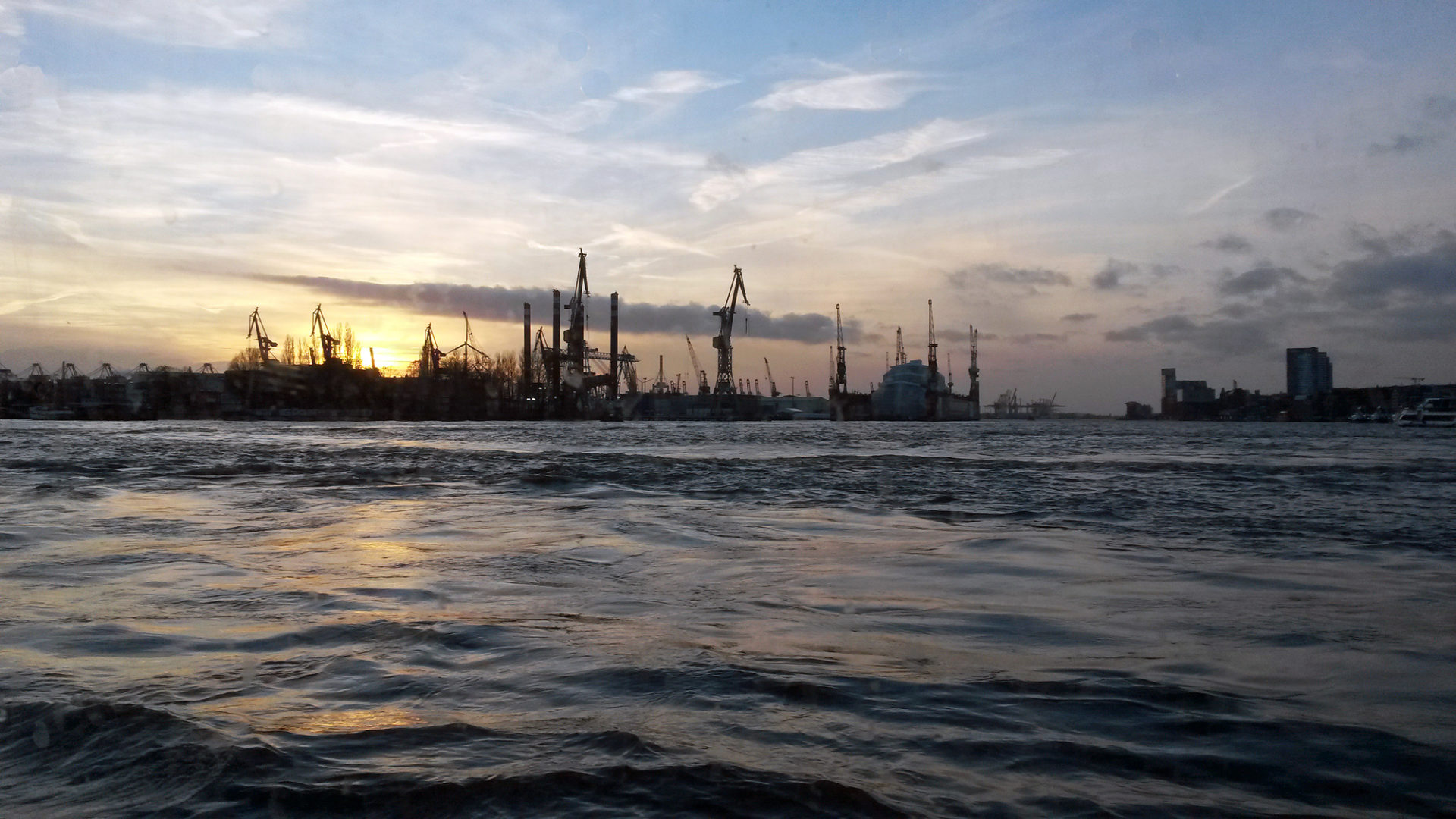 Hamburg im Winter: Sonnenuntergang am Hafen mit Elbblick und Kränen