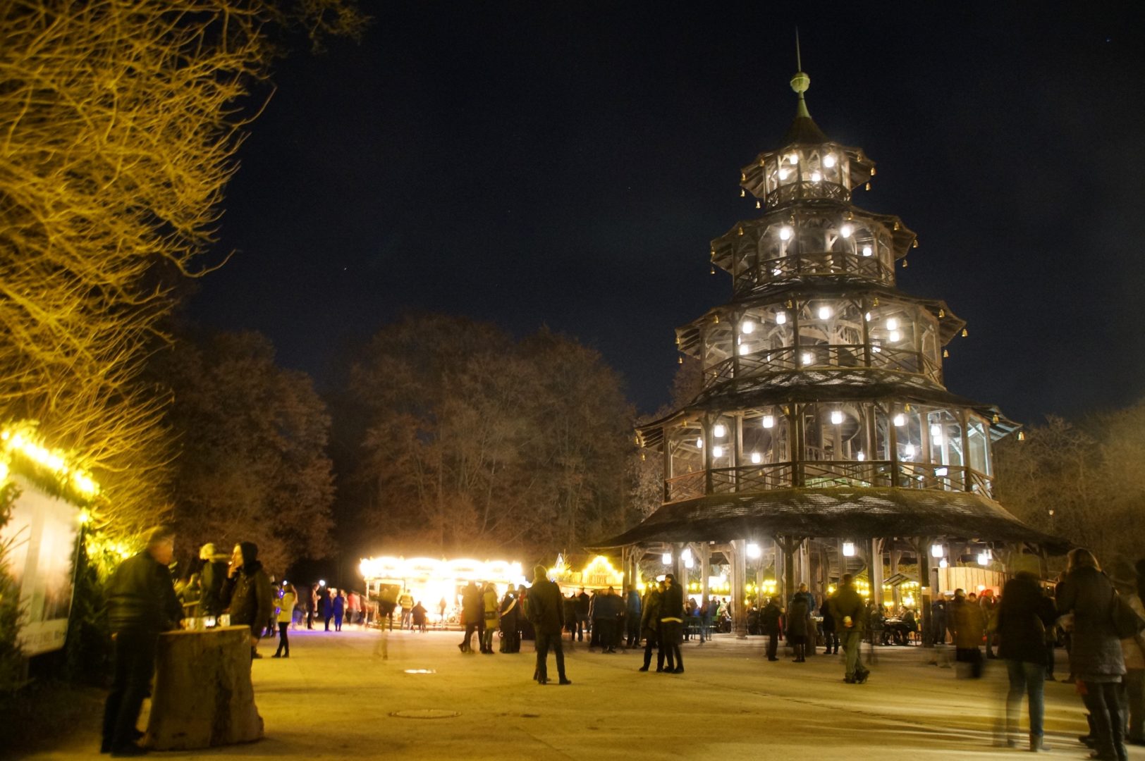 Ein Weihnachtsmarkt, wie er im Buche steht, möchte man meinen. Im Märchenbuch, wohlgemerkt! Der Weihnachtsmarkt am Chinesischen Turm liegt mitten in der Stadt und doch etwas abgelegen: eine hell erleuchtete Insel mitten im dunklen Wald. Ein Karussell dreht seine Runden, die Erwachsenen spielen Eisstockschießen und aus der Ferne erklingt das Glockengeschirr der Pferdekutsche! Dazu erklingt die Blaskapelle aus dem Turm und stimmt einen Klassiker an: „We wish you a merry christmas, we wish you a merry christmas and a happy new year!“